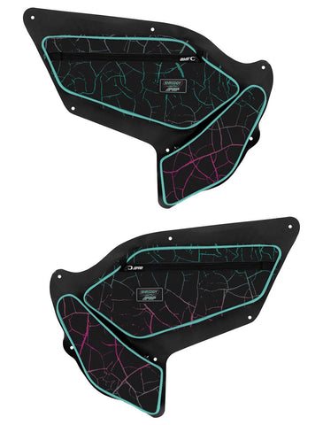 Protect your knees and add storage to your factory doors with these these PRP x Shreddy special edition Front Door Bags with Knee Pad for Polaris PRO XP, PRO R, Turbo R. These bags are great for holding onto the extra items you need while you ride. Conveniently located right next to you on the door (so you can still access them while strapped in). Made from durable, puncture resistant, and water resistant materials. The lower storage compartment contains a thick foam cushion to protect your knees from banging against the door in rough terrain. Or if you want, remove this foam piece, and use the space as another storage compartment. Each bag is designed to perfectly fit inside the factory PRO XP, PRO R, Turbo R stock doors - Simply remove the door skin, and reinstall it with the bag between the door frame and skin. Re-uses all factory hardware. Fits 2 Door and 4 Door Models (Front Doors only). Works both with or without the Polaris factory lower door inserts. Sold as a pair (Driver and Passenger).